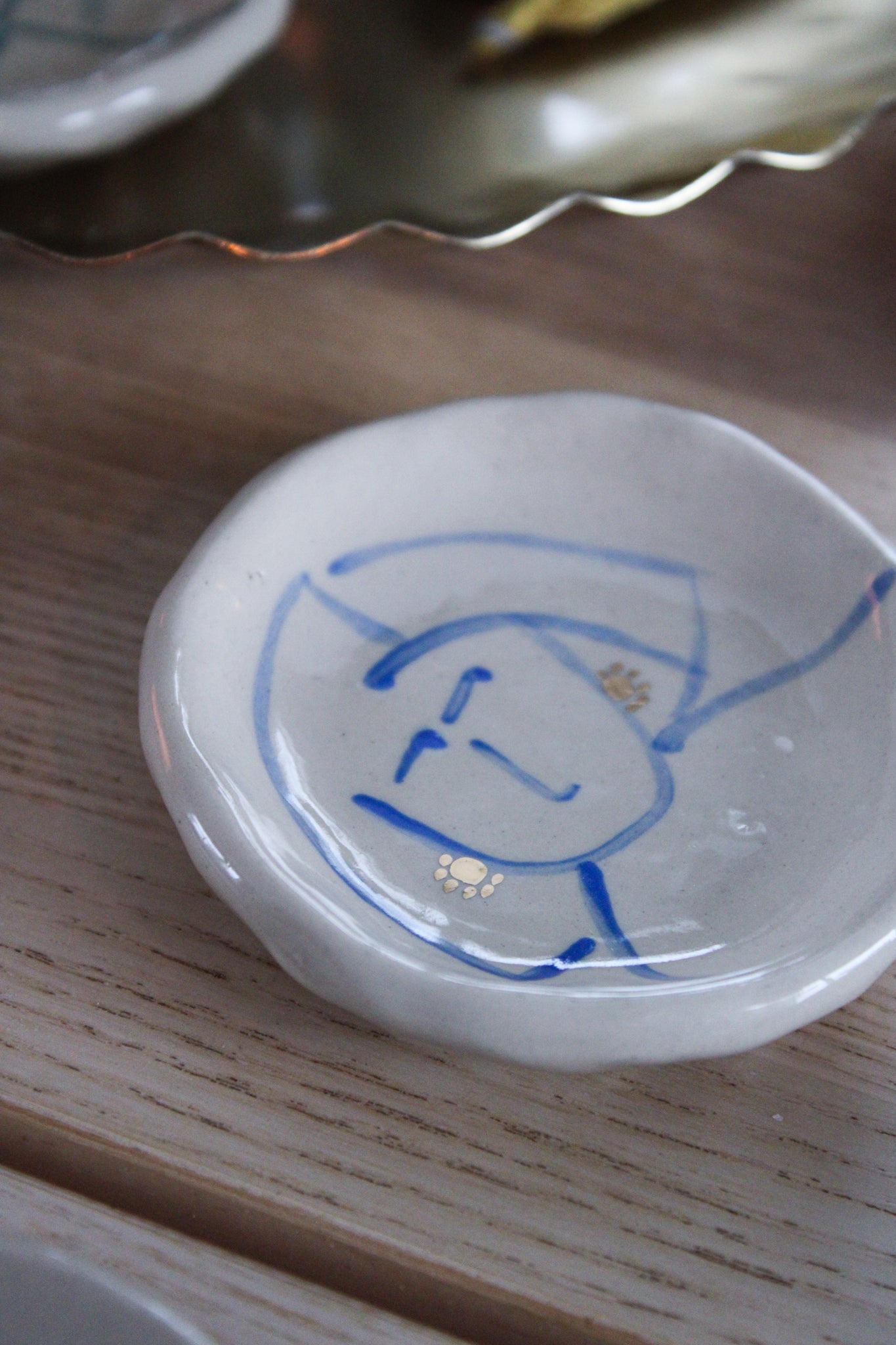 Handmålat minifat med örhängen av äkta guld.