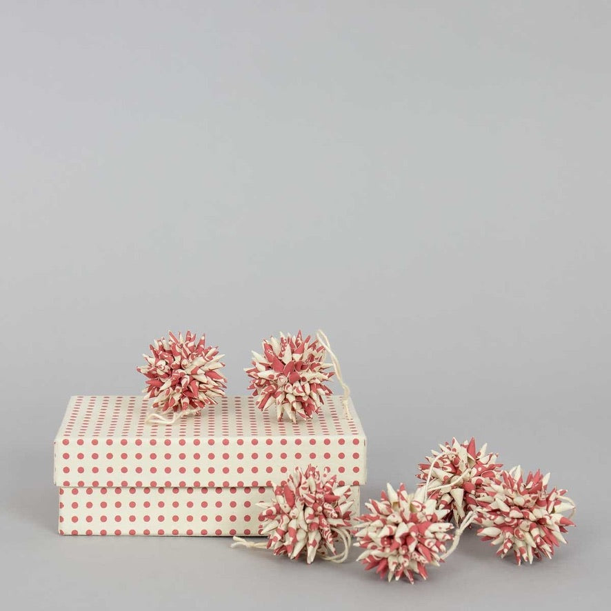 Vackert pappershantverk i en fin liten prickig låda. Varje låda innehåller 6 stycken stjärnor att hänga i granen. Papperstillverkningen skapar angelägen sysselsättning för framförallt kvinnor på landsbygden.
